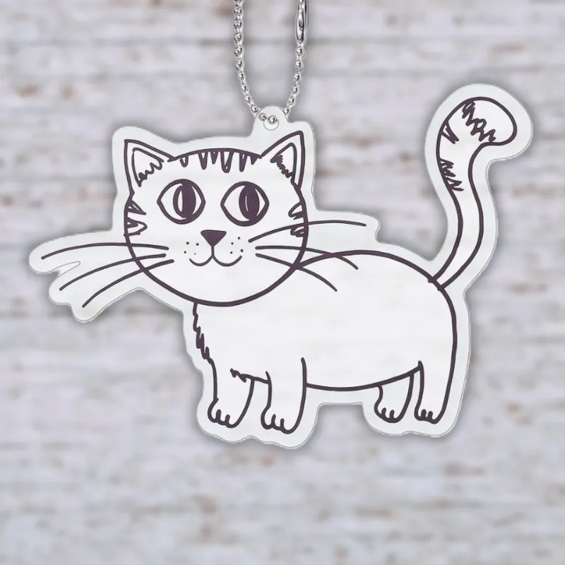 透明なアクリルに印刷を行い、ご希望の形に切り抜いたものに、専用ボールチェーンをつけ、キーホルダーとして使用できるようにした商品です。