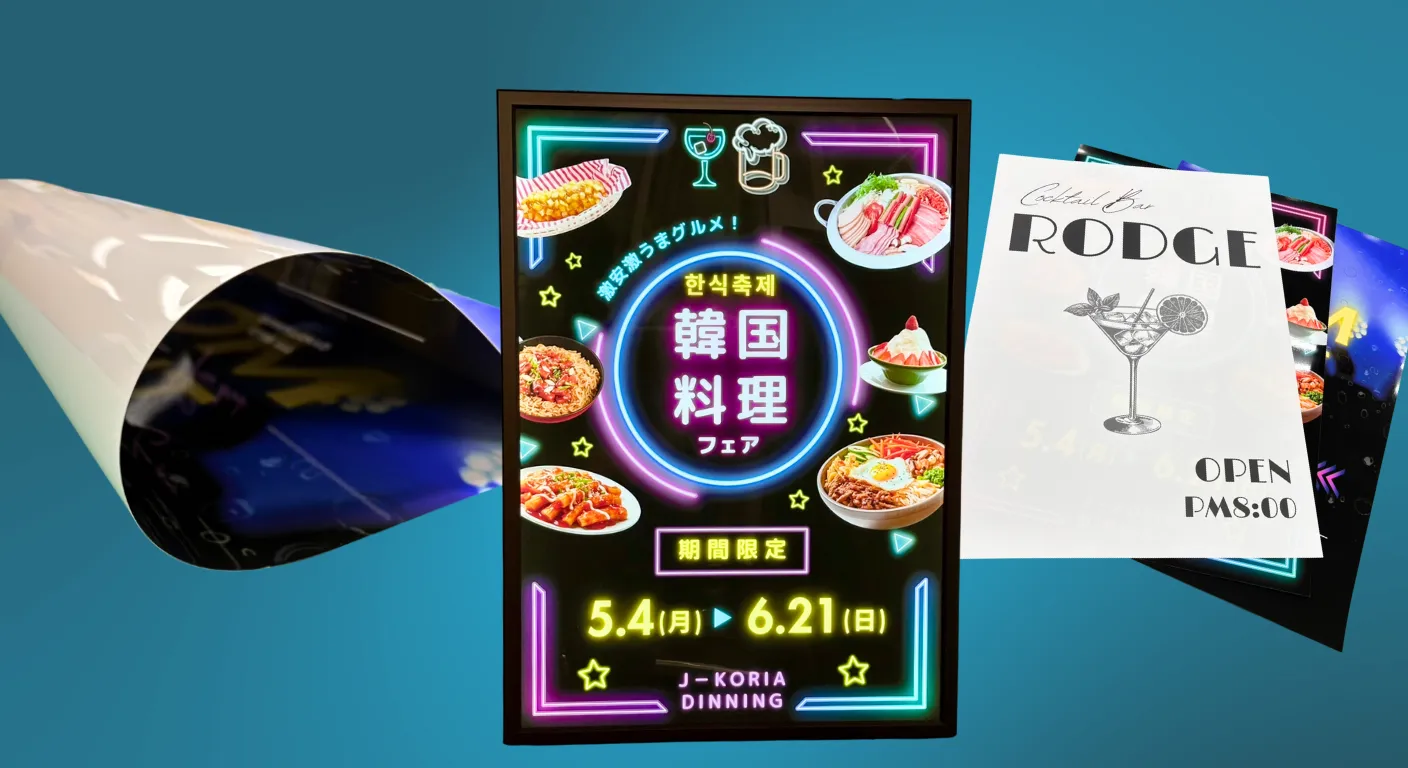 バックライトフィルムには、発色を重視した「グロスラミネート」、反射を抑えた「マットラミネート」の2タイプの質感から、制作するデザインや使用イメージに合わせてお選びいただけます。