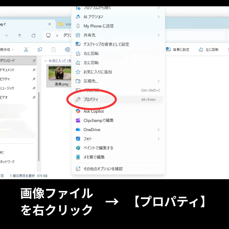 1.画像ファイルを右クリック>【プロパティ】を選択