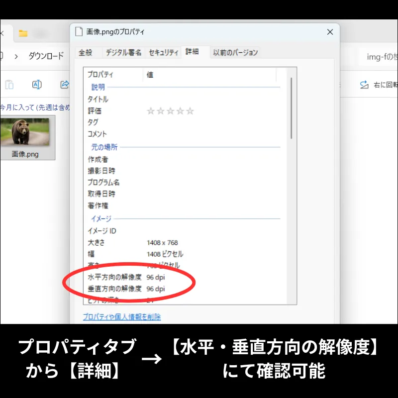 2.【詳細】タブにて【水平方向の解像度】【垂直方向の解像度】で確認いただけます。