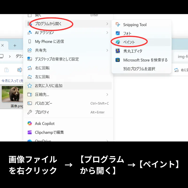 1.まず画像ファイルを右クリックし、【プログラムから開く】>【ペイント】を起動します。