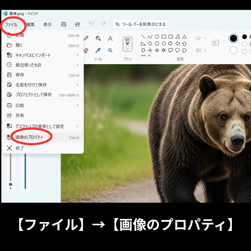 2.その後左上のメニューバーから【ファイル】>【画像のプロパティ】を選びます。