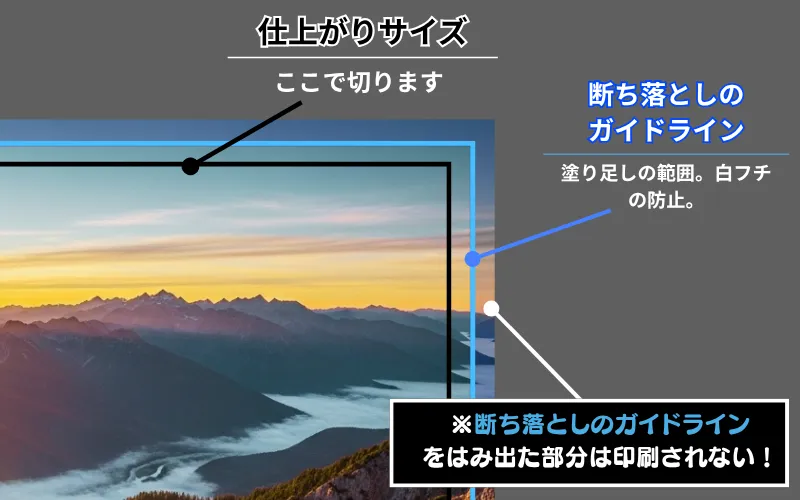 印刷する際に、デザインの端まで色や画像・写真を入れたいという場合は、断裁ズレで白フチを防ぐため、デザインに塗り足しを推奨しております。
