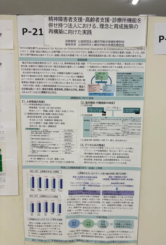 実際のポスターは、精神障害者リハビリテーション学会札幌大会で発表した「精神障害者支援・高齢者支援・診療所機能を併せ持つ法人における、理念と育成施策の再構築に向けた実践」という演題で使用しました。多くの方に立ち止まって見ていただき、印刷の美しさを褒められることもありました。今後も院内掲示や研修資料など、幅広い用途でビジプリを利用したいと思います。