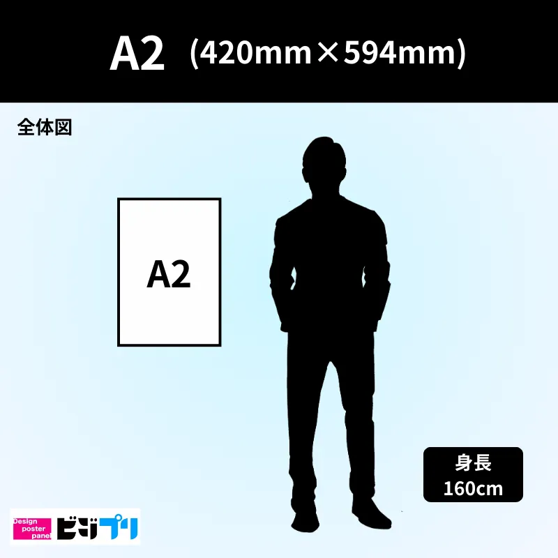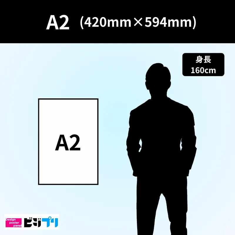 A2サイズはJIS規格の紙サイズで、寸法は 420mm × 594mm です。ポスターやLEDパネルに使われることが多く、迫力のあるビジュアルを展開する際に適しています。