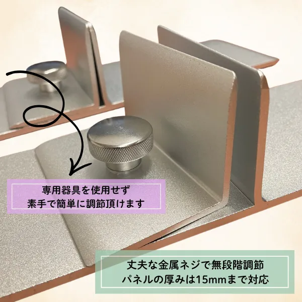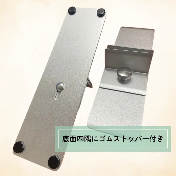 本製品は、逆向きのT字形状をした金属スタンドをパネル下部の2箇所に取り付けて安定させる構造です。 底部には滑り止め用のゴムが付いているため、屋内の平滑な床面でも設置しやすく、パネルをしっかり支えます。