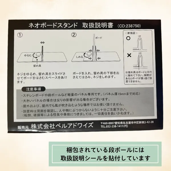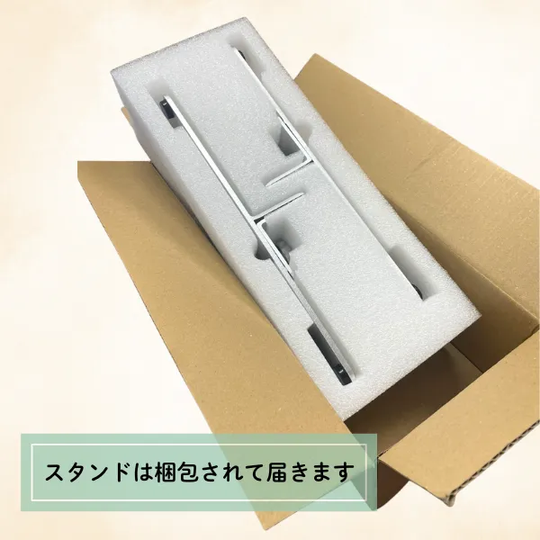 スタンドは緩衝材を使用して梱包された状態で届きます。また、梱包に使用している段ボールの外側には直立自立スタンドの使用方法が記載されておりますので安心してご利用頂けます。