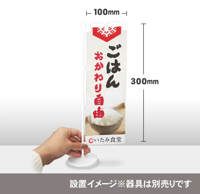 高さ300mm×幅100mmで卓上POPにもピッタリのミニのぼりです。標準的なポンジ素材で一般的なのぼりがそのまま小さくなったような可愛いサイズ感。