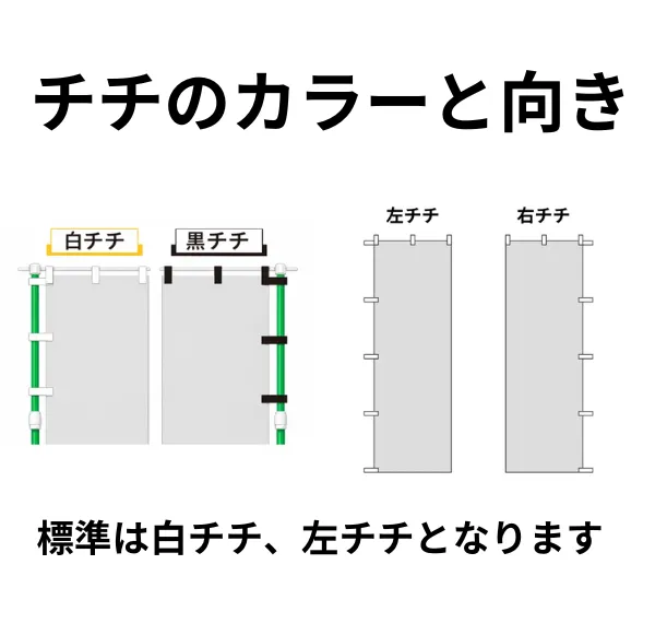 - チチ仕立て ポールに固定するための輪(チチ)を縫い付ける一般的な仕立てです。設置が簡単で、扱いやすいのが特長です。チチの位置には「右チチ」「左チチ」があり、標準的な位置はのぼりの左側にチチが取り付けられた「左チチ」となります。