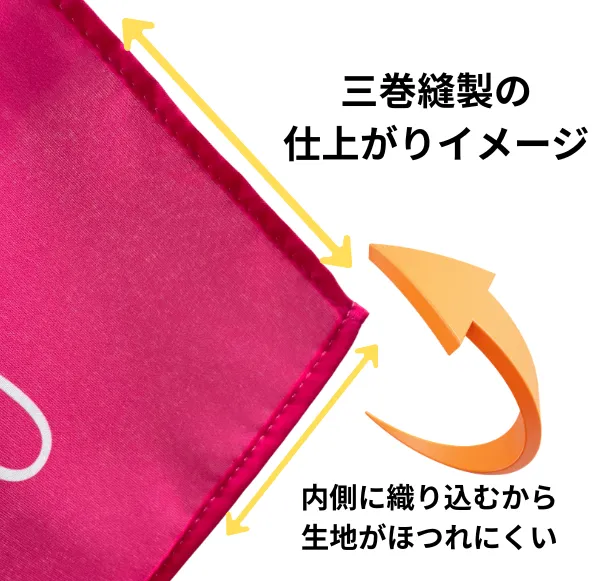 袋縫い加工を行う場合は袋縫いになっている2辺を除いた三方三巻縫製の仕様となります。