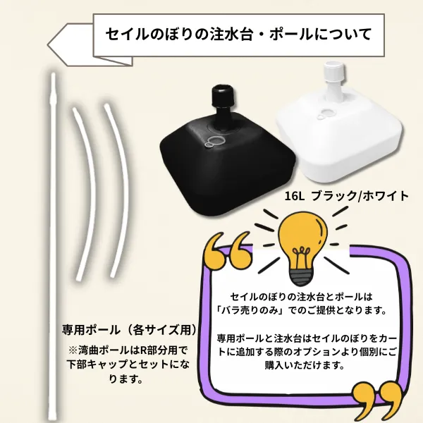 「16L注水台」と「セイルのぼり専用ポール」はそれぞれ別売りでオプションよりご購入いただけます。セイルのぼりの組み立て・設置方法