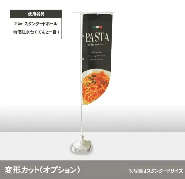 のぼりの下部を特殊な形状にカットして旗部分の印象を大きく変えることができる加工です。加工可能な変形カットは下記の3種類がございます。
