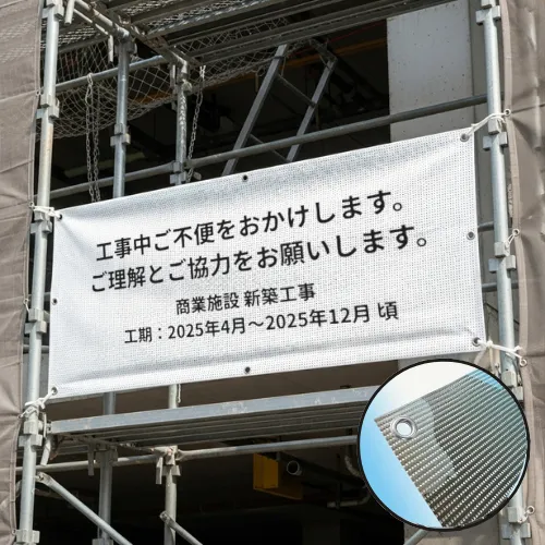 - 建設現場・仮囲い:通気性を保ちながら視線をやわらげ、ロゴや工事案内を分かりやすく表示