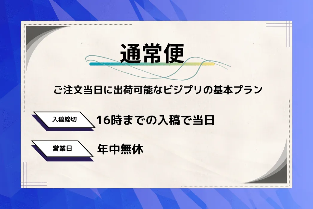 通常便とは、ビジプリが提供する値段と早さ重視のプランです。そのポイントを3つ紹介します!