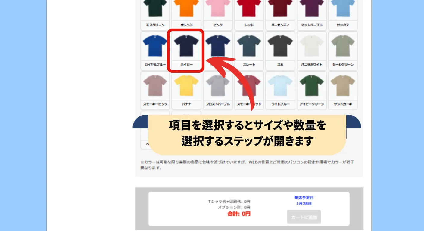 ご希望のウェア(Tシャツ / パーカー / スウェット)を選び、サイズ・カラー・枚数など、ご希望の内容を指定してご注文ください。