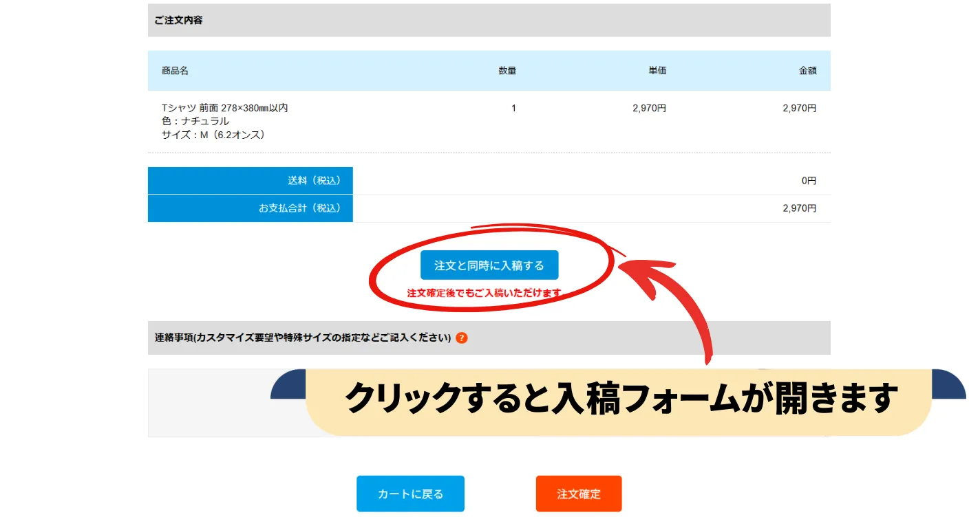 2.「配送先・お支払い」画面下部の「注文と同時に入稿する」をクリック