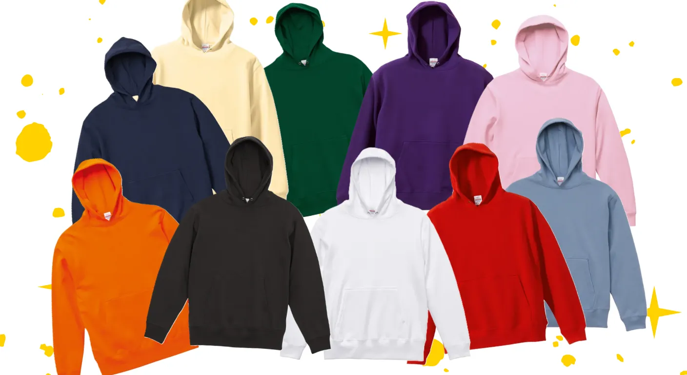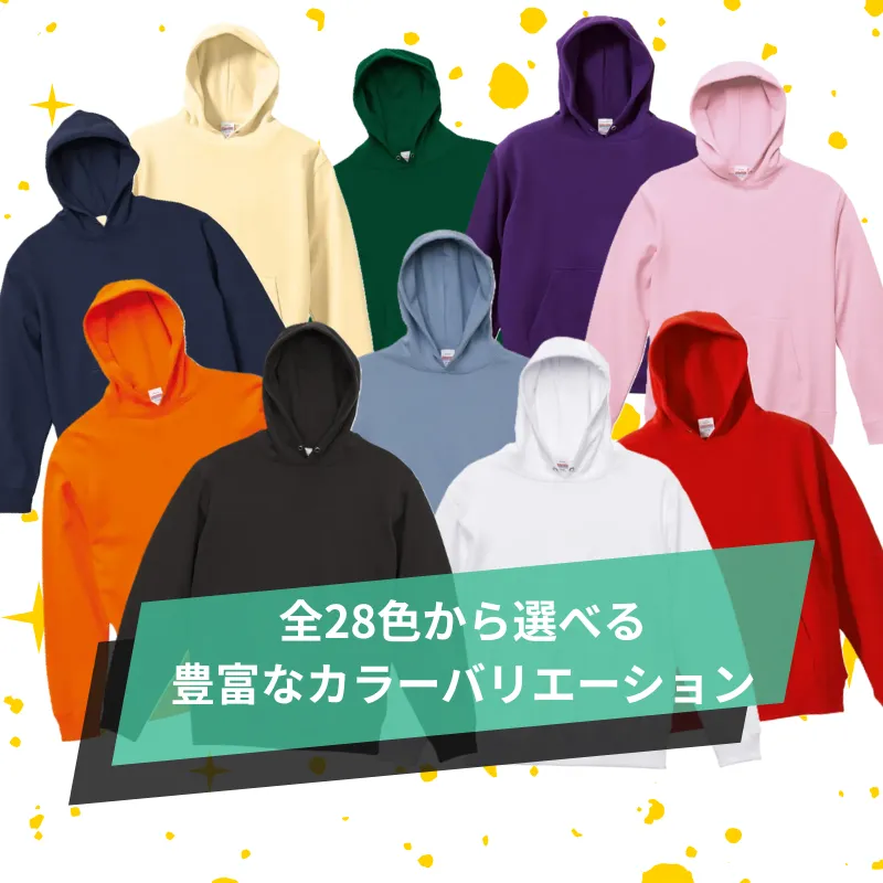 フォトパーカーは、S~XLの全4サイズ、定番色からアクセントカラーまで全28色を幅広くご用意しています。
