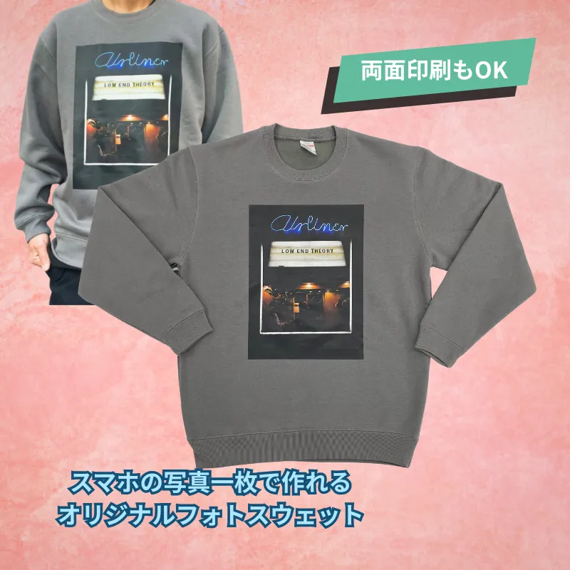 片面印刷の料金を含めて手ごろで嬉しい1枚5,060円!定番の裏パイル(裏毛)スウェット生地仕様で、はじめてのフォトプリントスウェットでも選び方がシンプル。デザインの白ベース印刷も含んだ料金で、両面印刷も+660円で制作できます。