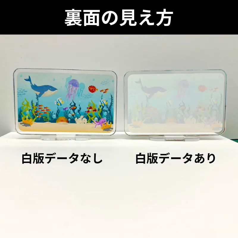 ②の【白ベース(白版)データ】は、なくても制作可能ですが、下記画像のように、白い場所以外ではメインの色が薄れてしまい迫力が出にくくなります。