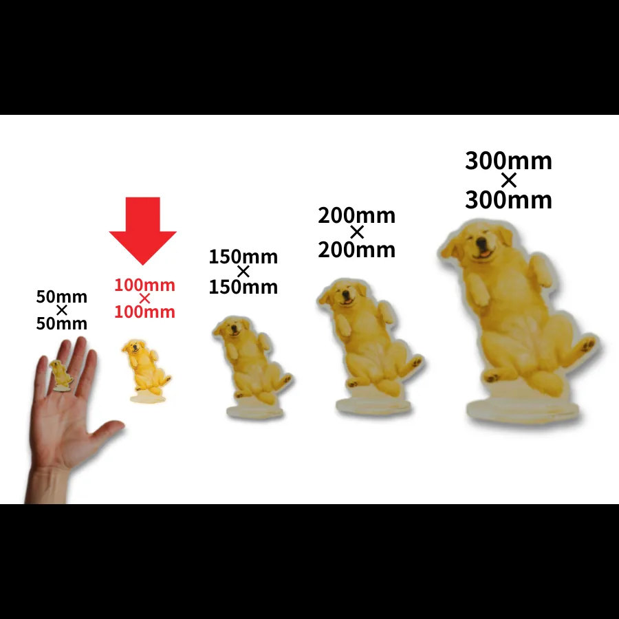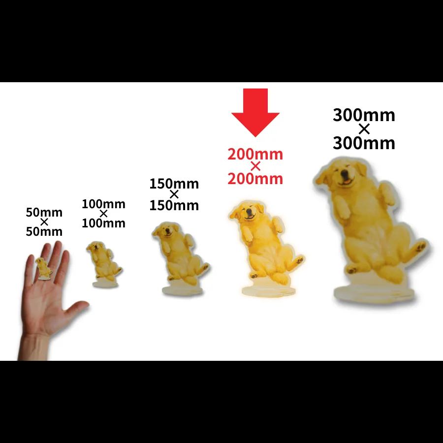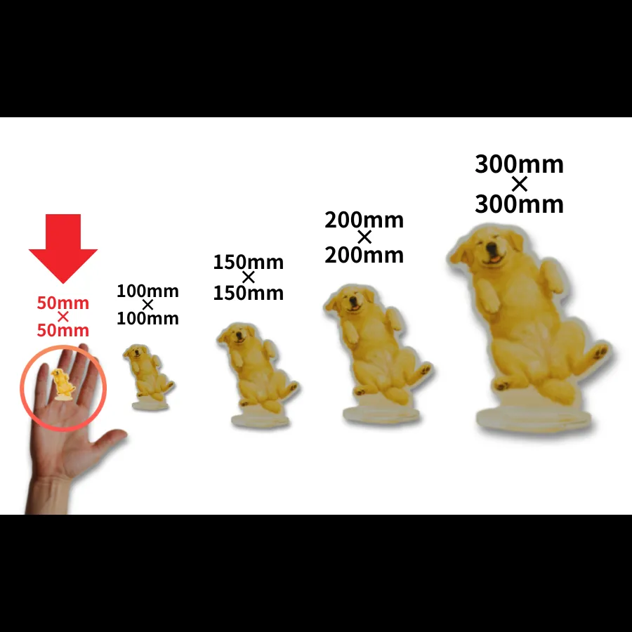 アクリルスタンドの取り扱いサイズに関しては【50mm×50mm】【100mm×100mm】【150mm×150mm】【200mm×200mm】【300mm×300mm】の5種類展開となっております。