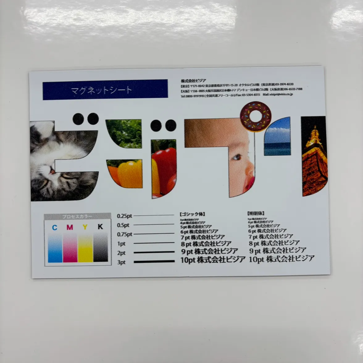 マットラミネートを施したマグネットは、光の反射を抑えた落ち着いた仕上がりが特徴です。写真を素材に使った場合でも色味が派手になりすぎず、全体に上品で見やすい印象を与えてくれます。 また、サンプルではロゴや文字を太さ・大きさごとに比較しており、実際の印刷でどの程度の読みやすさが得られるかを確認できます。小さな文字はやや抑えられた発色で落ち着いた雰囲気に、大きな文字や太字はしっかりと存在感を示し、デザインの主役として映える仕上がりになります。 用途やデザインに合わせて、このマット仕上げ特有の質感や文字の見え方をぜひ参考にしてみてください。