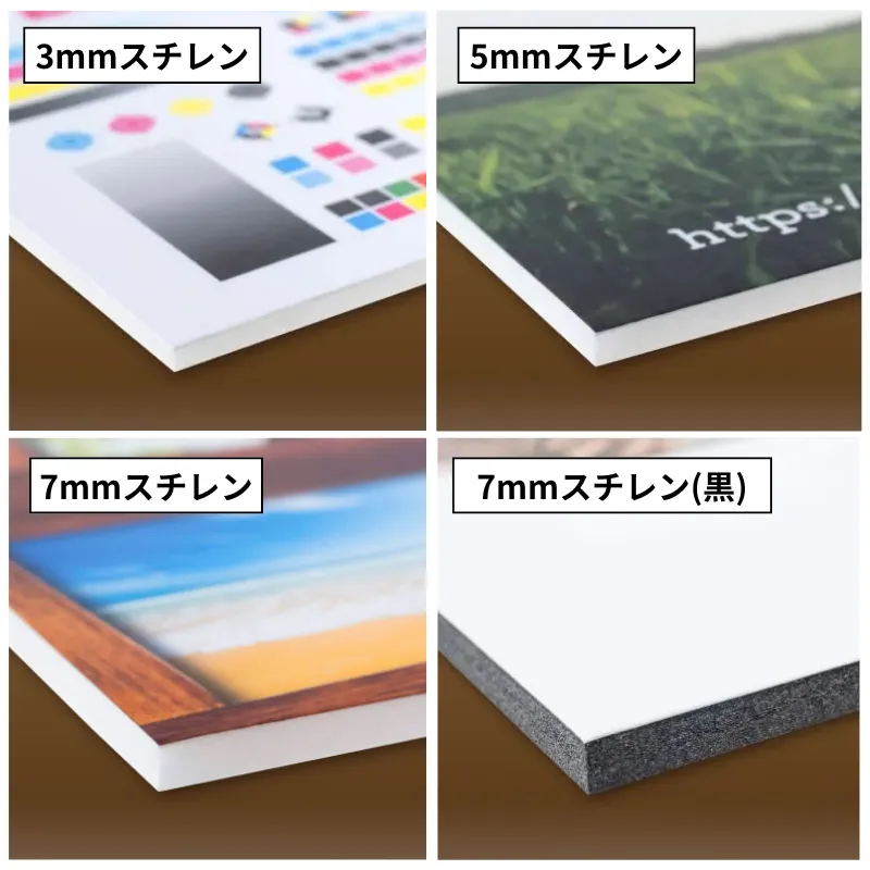 7mmスチレンパネルに比べてやや薄く、3mmタイプよりもしっかりしているため、持ち運びや掲示作業がしやすく、破損リスクも少ないバランスの良い仕様です。