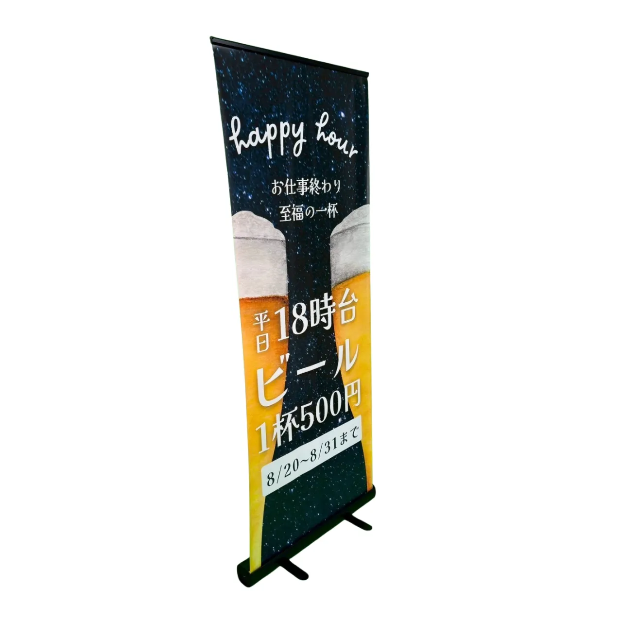 イベントや店舗、飲食店などで使用するスタンドアローンタイプのロールアップバナーの印刷・制作サービスです。