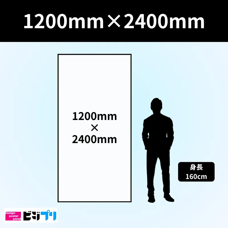 1200mm×2400mmサイズは、店舗・イベント空間の「メインビジュアル」として利用できる上に視認距離が長くても文字や画像がはっきり見えるのがメリットです。