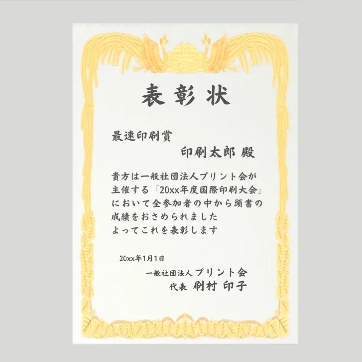 弊社の印刷サービスを使えば、このようなオリジナルの賞状も簡単に作れます!