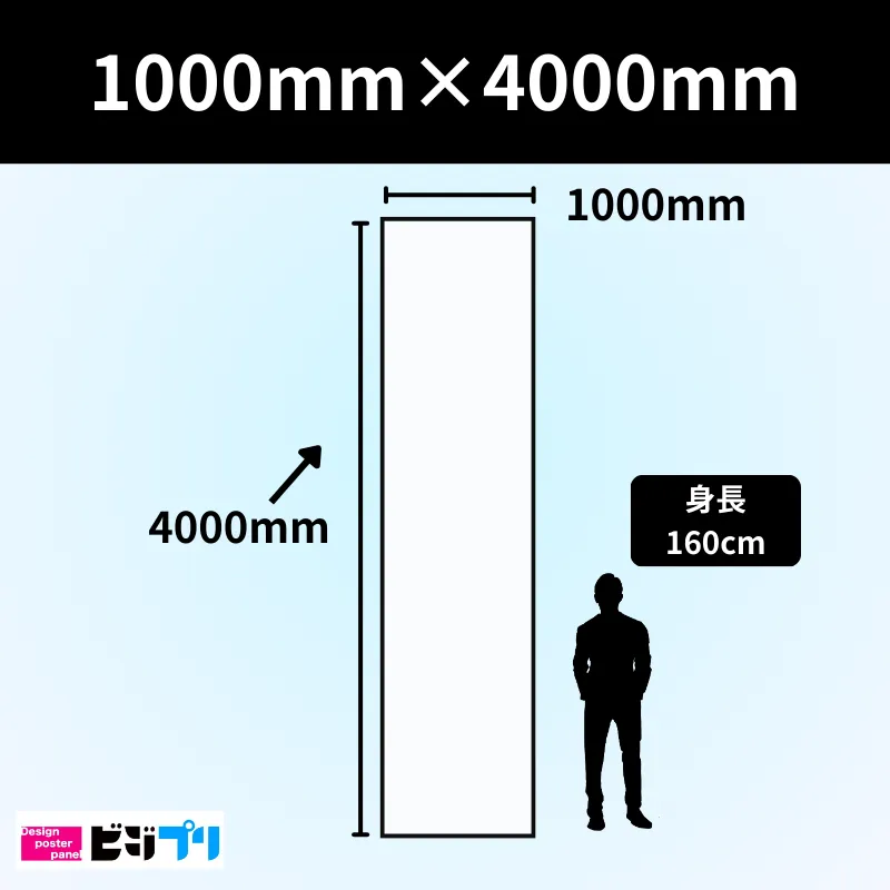 1000mm×4000mmサイズ(1m×4m)の印刷物は、あまり頻繁に使われるサイズではありません。 使用されるケースとしては、吊り看板や懸垂幕、横断幕などに使用されます。 ビジプリでは、1000mm×4000mmの印刷を1枚から即日対応で承っております。まずはお問い合わせください。