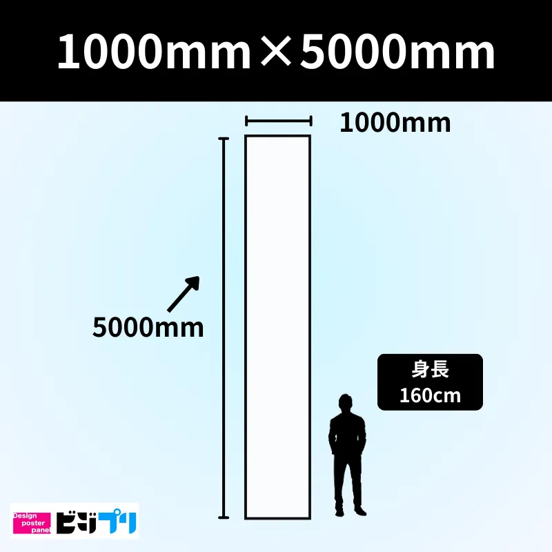 1000mm×5000mmサイズ(1m×5m)の印刷物は、あまり頻繁に使われるサイズではありません。 使用されるケースとしては、吊り看板や懸垂幕、横断幕などに使用されます。 ビジプリでは、1000mm×5000mmの印刷を1枚から即日対応で承っております。まずはお問い合わせください。