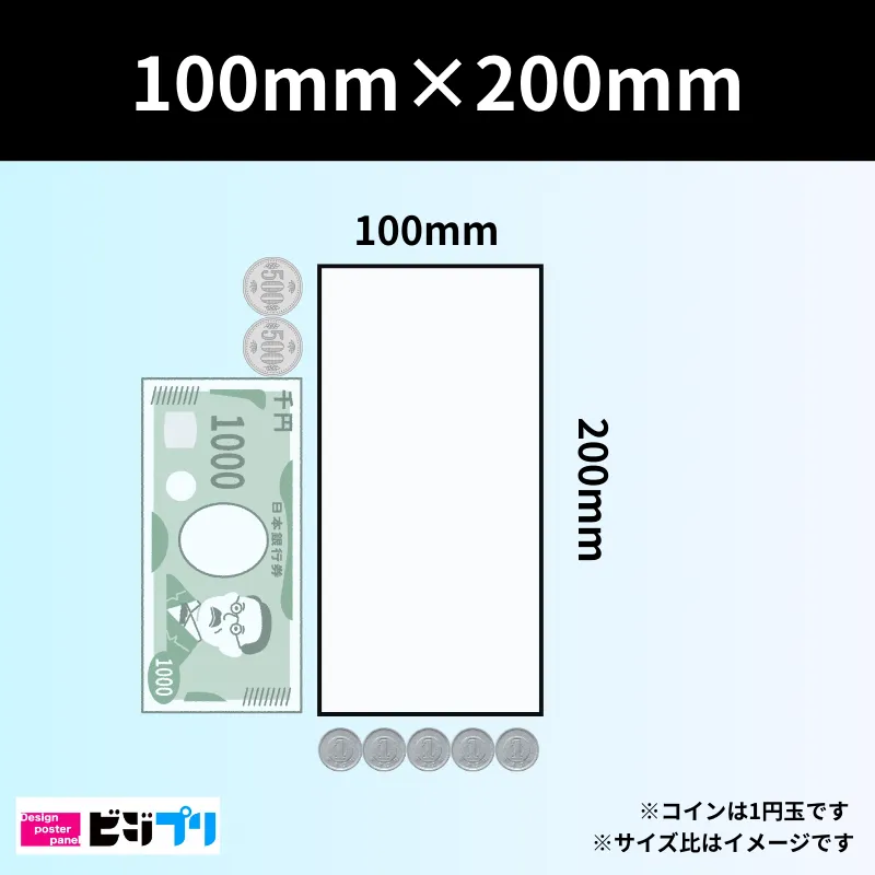 100mm×200mmサイズ(10cm×20cm)の印刷物は、あまり頻繁に使われるサイズではありません。 使用されるケースとしては、窓や壁面に貼るシールやパネルなどが多く、一部のメニュー看板や案内パネルにも使用されます。 ビジプリでは、100mm×200mmの印刷を1枚から即日対応で承っております。まずはお問い合わせください。