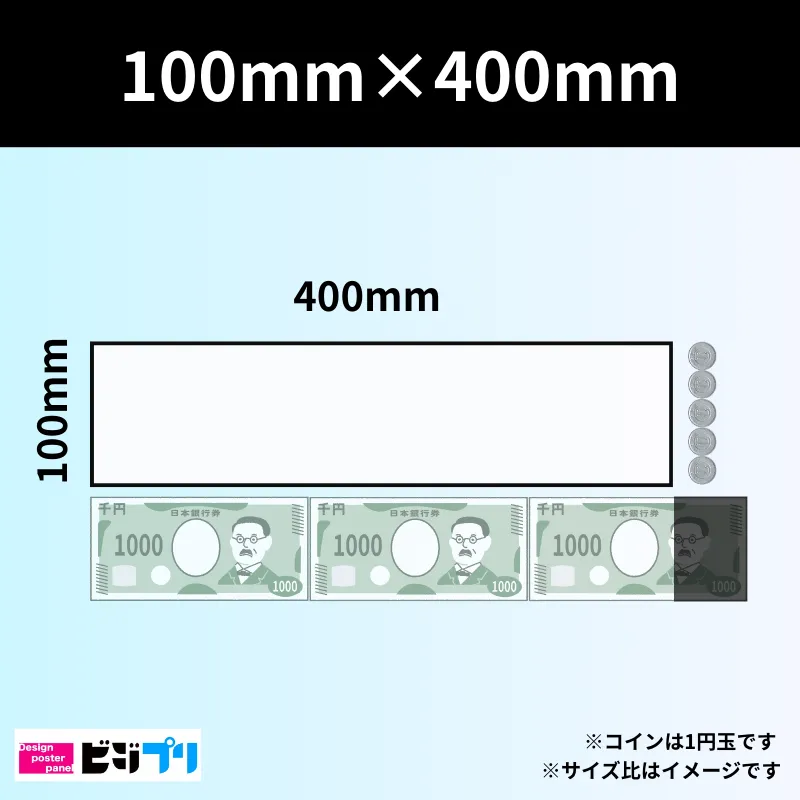 100mm×400mmサイズ(10cm×40cm)の印刷物は、あまり頻繁に使われるサイズではありません。 使用されるケースとしては、窓や壁面に貼るシールやパネルなどが多く、一部のメニュー看板や案内パネルにも使用されます。 ビジプリでは、100mm×400mmの印刷を1枚から即日対応で承っております。まずはお問い合わせください。