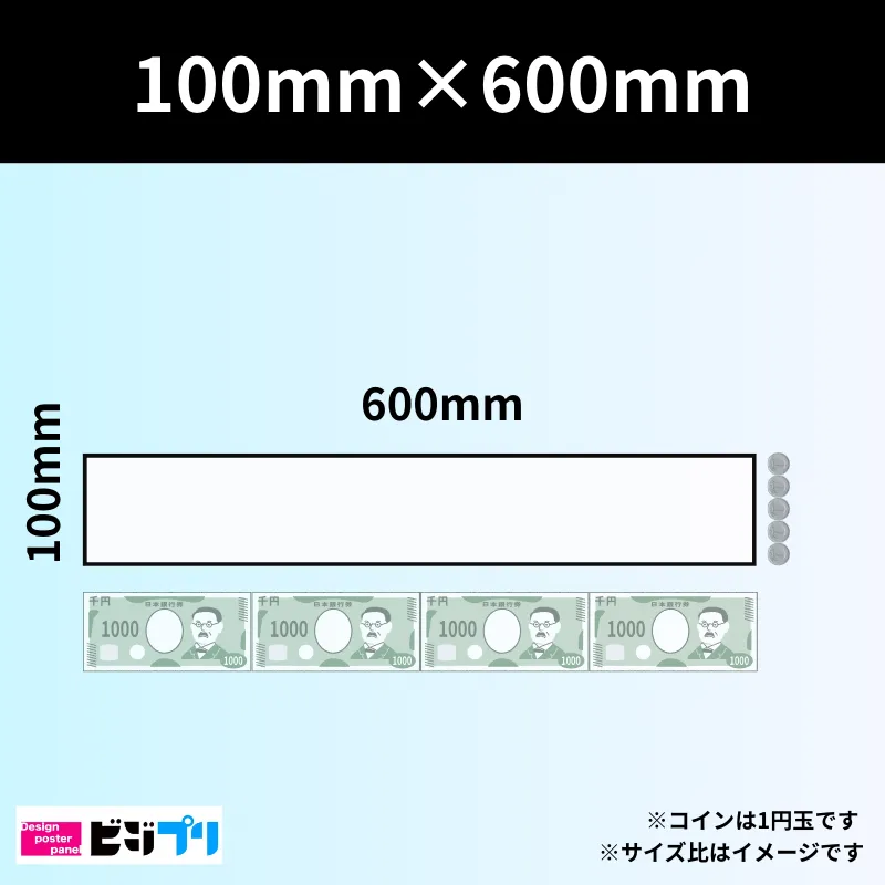 100mm×600mmサイズ(10cm×60cm)の印刷物は、あまり頻繁に使われるサイズではありません。 使用されるケースとしては、窓や壁面に貼るシールやパネルなどが多く、一部のメニュー看板や案内パネルにも使用されます。 ビジプリでは、100mm×600mmの印刷を1枚から即日対応で承っております。まずはお問い合わせください。