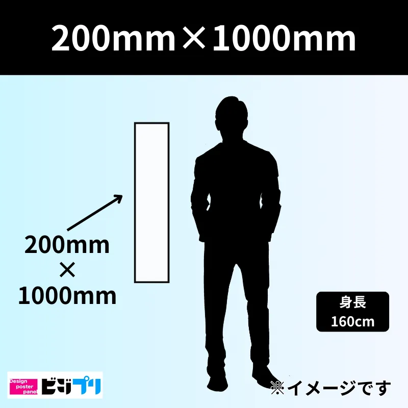 200mm×1000mmサイズ(20cm×1m)の印刷物は、あまり頻繁に使われるサイズではありません。 使用されるケースとしては、窓や壁面に貼るシールやパネルなどが多く、一部のメニュー看板や案内パネルにも使用されます。 ビジプリでは、200mm×1000mmの印刷を1枚から即日対応で承っております。まずはお問い合わせください。