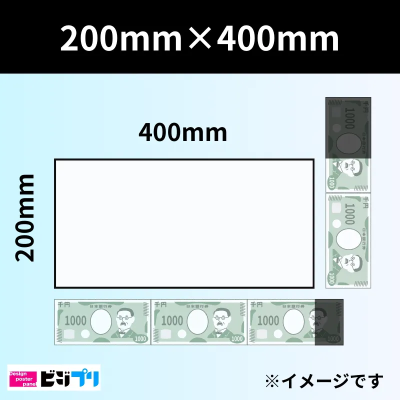200mm×400mmサイズ(20cm×40cm)の印刷物は、あまり頻繁に使われるサイズではありません。 使用されるケースとしては、窓や壁面に貼るシールやパネルなどが多く、一部のメニュー看板や案内パネルにも使用されます。 ビジプリでは、200mm×400mmの印刷を1枚から即日対応で承っております。まずはお問い合わせください。