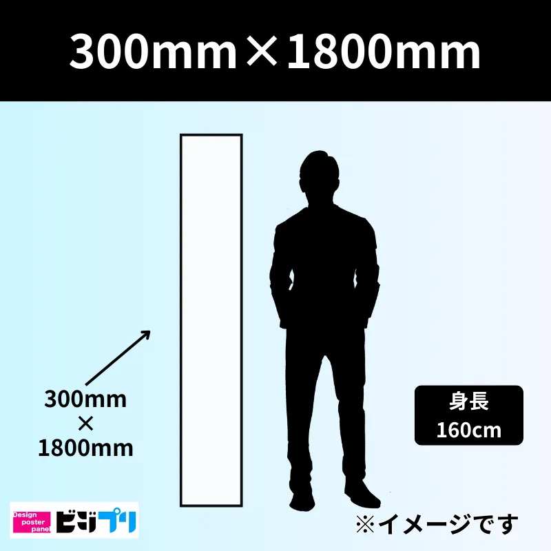 300mm×1800mmサイズ(30cm×1.8m)の印刷物は、あまり頻繁に使われるサイズではありません。 使用されるケースとしては、窓や壁面に貼るシールやパネルなどが多く、一部のメニュー看板や案内パネルにも使用されます。 ビジプリでは、300mm×1800mmの印刷を1枚から即日対応で承っております。まずはお問い合わせください。