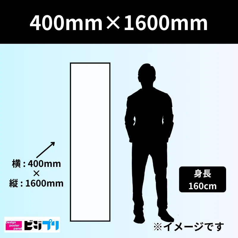400mm×1600mmサイズ(40cm×1.6cm)の印刷物は、あまり頻繁に使われるサイズではありません。 使用されるケースとしては、窓や壁面に貼るシールやパネルなどが多く、一部のメニュー看板や案内パネルにも使用されます。 ビジプリでは、400mm×1600mmの印刷を1枚から即日対応で承っております。まずはお問い合わせください。