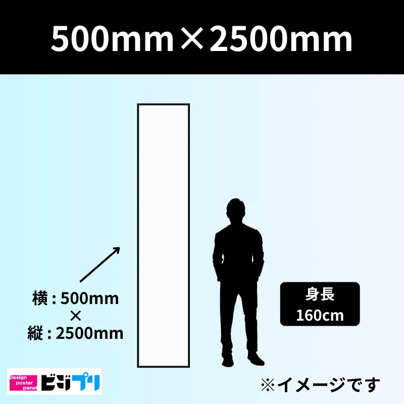 500mm×2500mmサイズ(50cm×2.5m)の印刷物は、あまり頻繁に使われるサイズではありません。 使用されるケースとしては、窓や壁面に貼るシールやパネルなどが多く、一部のメニュー看板や案内パネルにも使用されます。 ビジプリでは、500mm×2500mmの印刷を1枚から即日対応で承っております。まずはお問い合わせください。