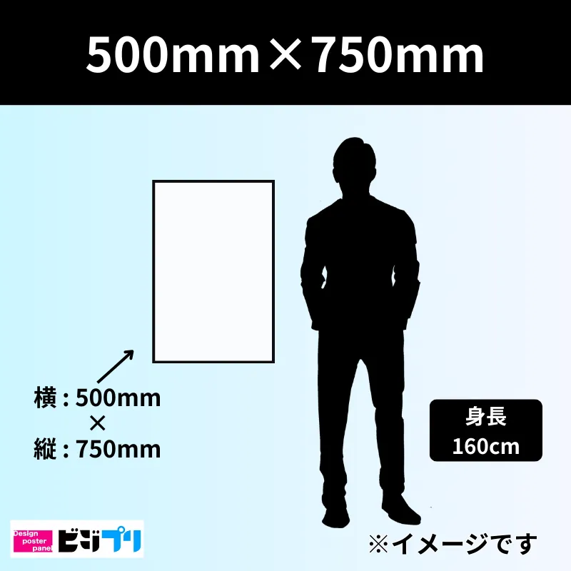 500mm×750mmサイズ(50cm×75cm)の印刷物は、あまり頻繁に使われるサイズではありません。 使用されるケースとしては、窓や壁面に貼るシールやパネルなどが多く、一部のメニュー看板や案内パネルにも使用されます。 ビジプリでは、500mm×750mmの印刷を1枚から即日対応で承っております。まずはお問い合わせください。