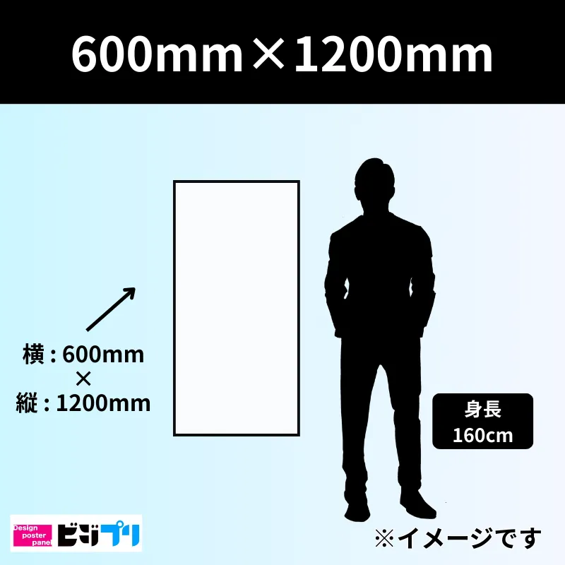 600mm×1200mmサイズ(0.6m×1.2m)の印刷物は、あまり頻繁に使われるサイズではありません。 使用されるケースとしては、窓や壁面に貼るシールやパネルなどが多く、一部のメニュー看板や案内パネルにも使用されます。 ビジプリでは、600mm×1200mmの印刷を1枚から即日対応で承っております。まずはお問い合わせください。