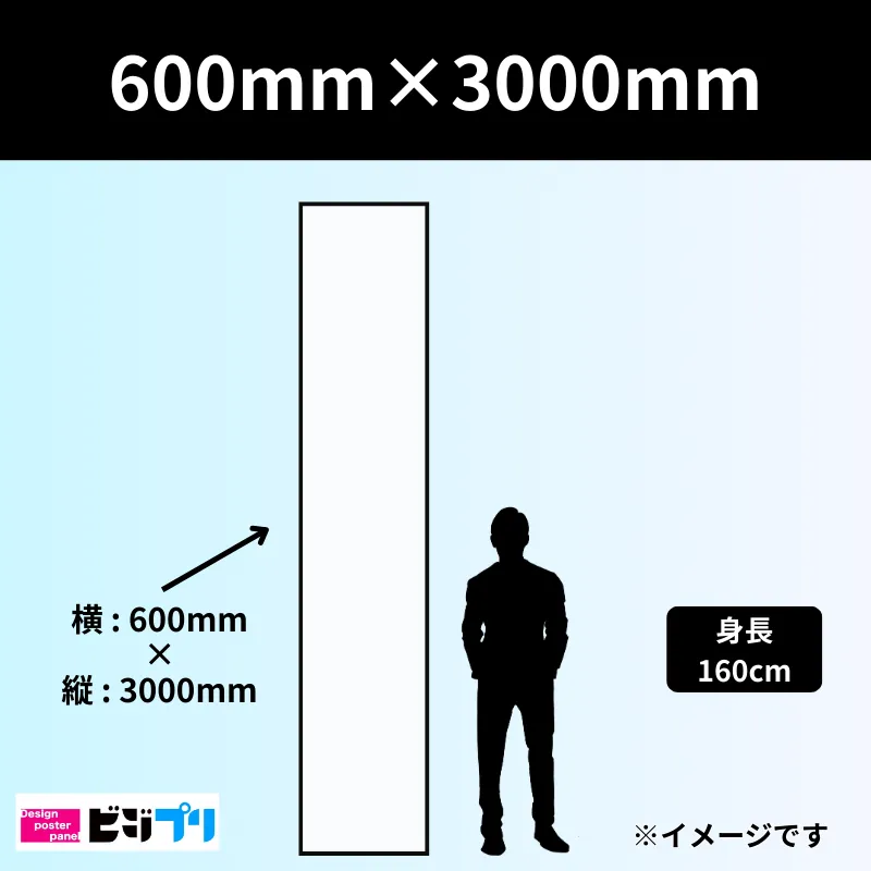 600mm×3000mmサイズ(0.6m×3m)の印刷物は、あまり頻繁に使われるサイズではありません。 使用されるケースとしては、窓や壁面に貼るシールやパネルなどが多く、一部のメニュー看板や案内パネルにも使用されます。 ビジプリでは、600mm×3000mmの印刷を1枚から即日対応で承っております。まずはお問い合わせください。