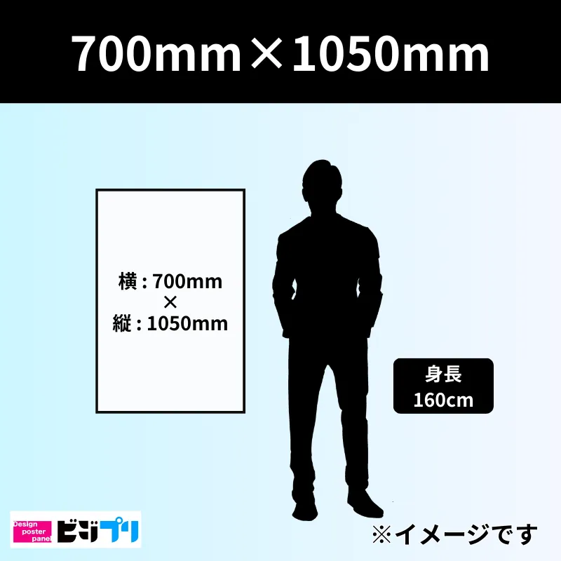700mm×1050mmサイズ(0.7m×1.05m)の印刷物は、あまり頻繁に使われるサイズではありません。 使用されるケースとしては、窓や壁面に貼るシールやパネルなどが多く、一部のメニュー看板や案内パネルにも使用されます。 ビジプリでは、700mm×1050mmの印刷を1枚から即日対応で承っております。まずはお問い合わせください。