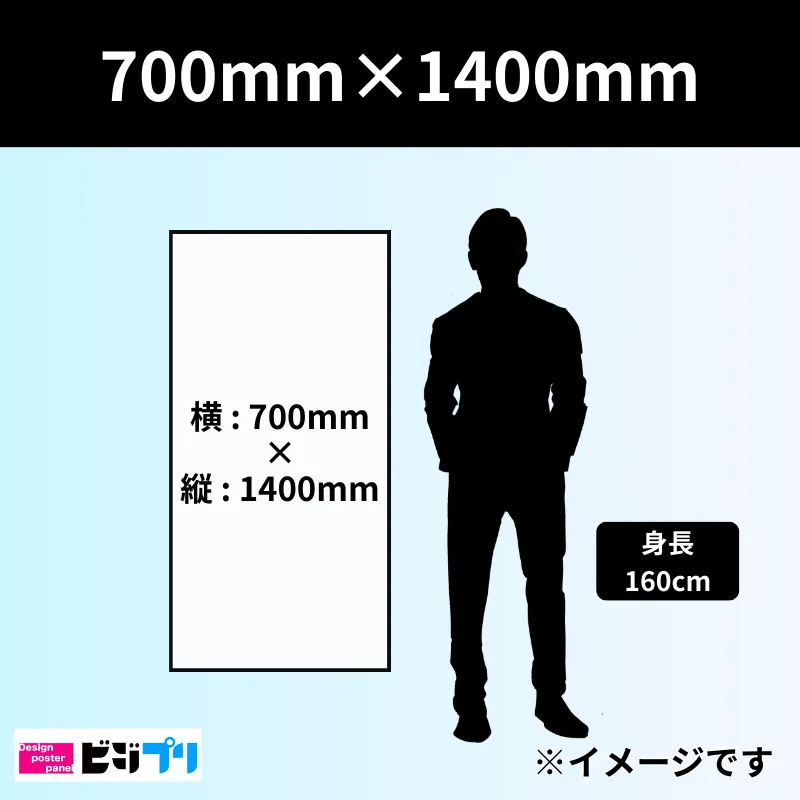 700mm×1400mmサイズ(0.7m×1.4m)の印刷物は、あまり頻繁に使われるサイズではありません。 使用されるケースとしては、窓や壁面に貼るシールやパネルなどが多く、一部のメニュー看板や案内パネルにも使用されます。 ビジプリでは、700mm×1400mmの印刷を1枚から即日対応で承っております。まずはお問い合わせください。