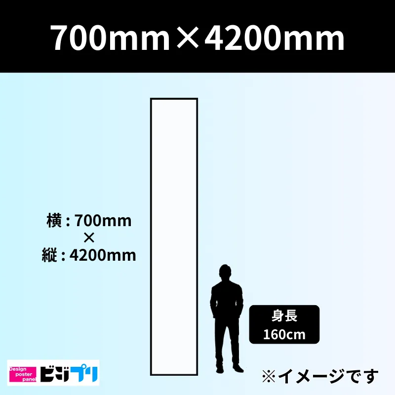 700mm×4200mmサイズ(0.7m×4.2m)の印刷物は、あまり頻繁に使われるサイズではありません。 使用されるケースとしては、窓や壁面に貼るシールやパネルなどが多く、一部のメニュー看板や案内パネルにも使用されます。 ビジプリでは、700mm×4200mmの印刷を1枚から即日対応で承っております。まずはお問い合わせください。