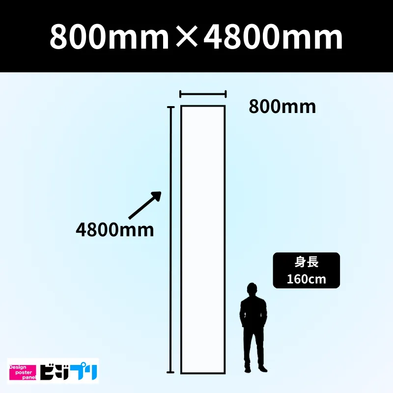 800mm×4800mmサイズ(0.8m×4.8m)の印刷物は、あまり頻繁に使われるサイズではありません。 使用されるケースとしては、吊り看板や懸垂幕、横断幕などに使用されます。 ビジプリでは、800mm×4800mmの印刷を1枚から即日対応で承っております。まずはお問い合わせください。