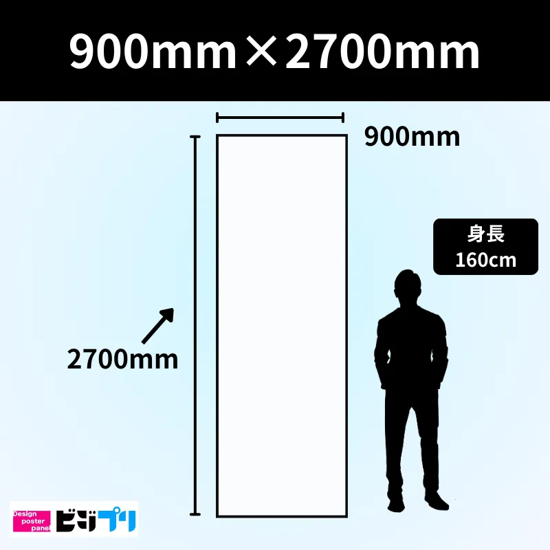 900mm×2700mmサイズ(0.9m×2.7m)の印刷物は、あまり頻繁に使われるサイズではありません。 使用されるケースとしては、吊り看板や懸垂幕、横断幕などに使用されます。 ビジプリでは、900mm×2700mmの印刷を1枚から即日対応で承っております。まずはお問い合わせください。