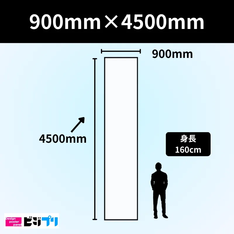 900mm×4500mmサイズ(0.9m×4.5m)の印刷物は、あまり頻繁に使われるサイズではありません。 使用されるケースとしては、吊り看板や懸垂幕、横断幕などに使用されます。 ビジプリでは、900mm×4500mmの印刷を1枚から即日対応で承っております。まずはお問い合わせください。