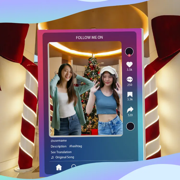 アカウント名・アイコン・キャプション・投稿日時に加え、再生数/いいね/コメント/共有などの反応UIまで自由に差し替え可能。くり抜き部分から顔を出して撮るだけで、来場者が“今流れている動画の主役”になったような一枚が作れます。