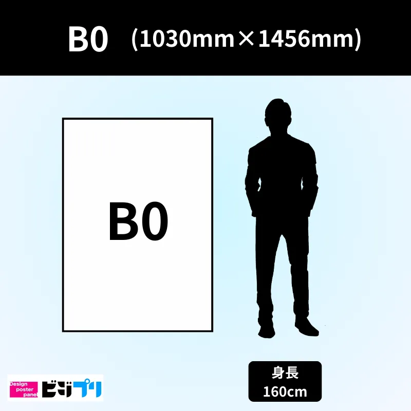 B0サイズはJIS規格の紙サイズで、寸法は 1030mm × 1456mm です。ポスターやトレーシングペーパーに使われることが多く、迫力のあるビジュアルを展開する際に適しています。